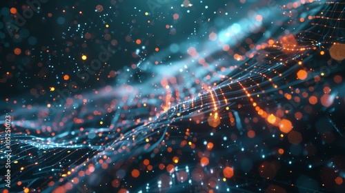© Justlight, Obraz premium Complex network of interconnected nodes and glowing particles forming a dynamic data stream, symbolizing the flow of information in a futuristic cyberspace
