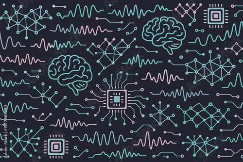 © MaximB, Fototapeta premium Complex patterns showcasing artificial intelligence concepts with circuits and brain illustrations on a dark background