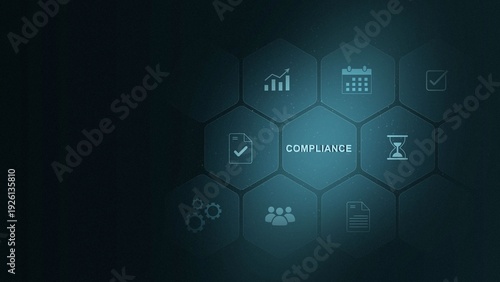 Fototapeta premium Compliance ensures alignment with standards, laws, and policies. A strong compliance system helps enforce regulation, protect organizations, and digital 3d interface and illustration