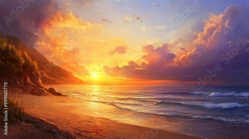 © wrap01, Fototapeta premium Compose a poem capturing the ethereal beauty of a sunset over a picturesque beach background. --ar 16:9 --v 6.1 Job ID: 93f5140c-9b54-44de-96b2-5b388c915b96