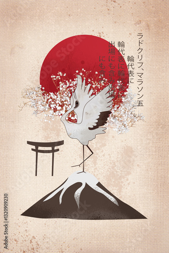 © deagreez, Fototapeta premium Composite image artwork 3D collage of asia traditional national element sun landluage character gate flower bird beak stand mountain fuji