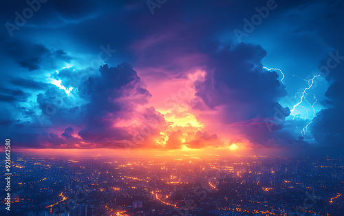 © udayanga, Fototapeta premium Composite Image of Blue Sky, Stormy Clouds, and Lightning for Weather Forecasting