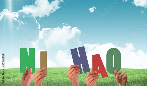 Naklejka premium Composite image of hands holding up ni hao