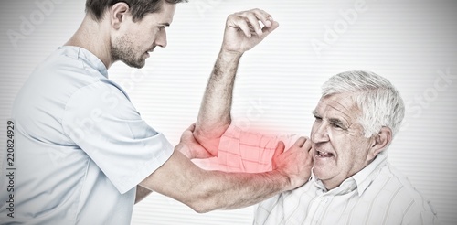 © vectorfusionart, Obraz premium Composite image of physiotherapist assisting senior man to