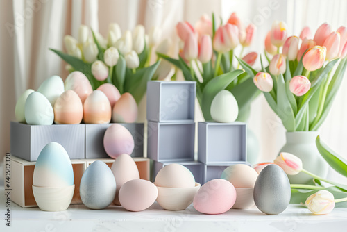Fototapeta premium composition Easter eggs painted pastel colors, gift boxes and bouquets of pink and white tulips