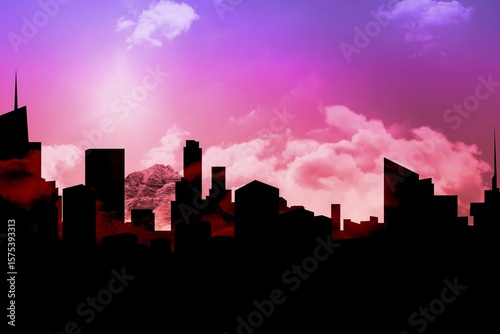 Fototapeta premium Composition of black cityscape over mountains and clouds with blue sky