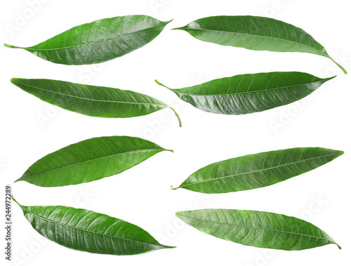 © New Africa, Fototapeta premium Composition of fresh mango leaves on white background, top view
