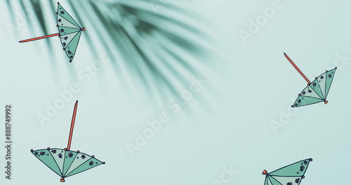 Naklejka premium Composition of green cocktail umbrellas falling over palm tree leaves on...
