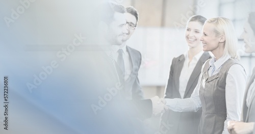 © vectorfusionart, Obraz premium Composition of happy diverse business team shaking hands with motion blur