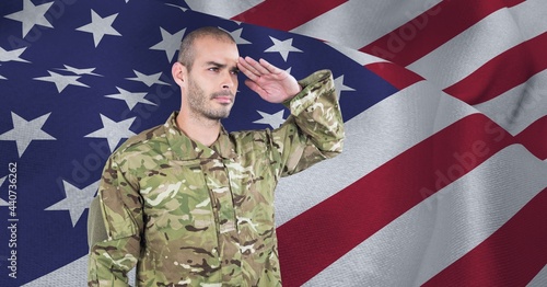 © vectorfusionart, Fototapeta premium Composition of male soldier saluting over american flag