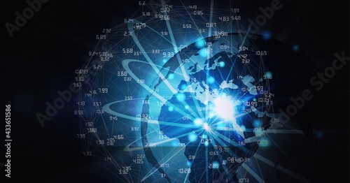 Obraz premium Composition of network of connections with numbers over globe on black...