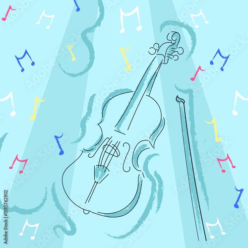Fototapeta premium Composition of notes and violing drawing on blue background
