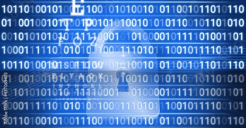 © vectorfusionart, Obraz premium Composition of online security padlock icon, eye test letters and binary coding