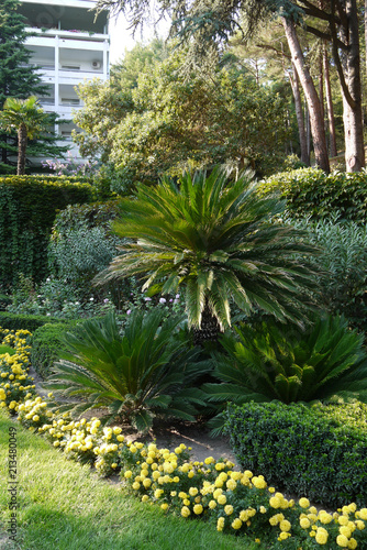 Fototapeta premium composition of palm trees, ornamental bushes and yellow flowers