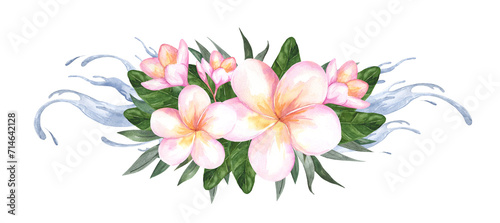 Naklejka premium Composition of plumeria flowers. Frangipani and palm leaves isolated on white background. Watercolor botanical illustration for cosmetics and perfume packaging design