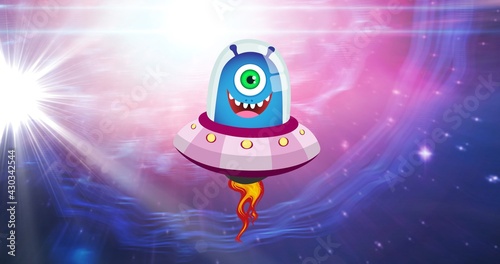 © vectorfusionart, Fototapeta premium Composition of smiling alien in spaceship and glowing light over stars on pink to purple background