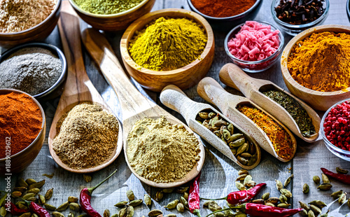 © monticellllo, Fototapeta premium Composition with assorted spices and herbs