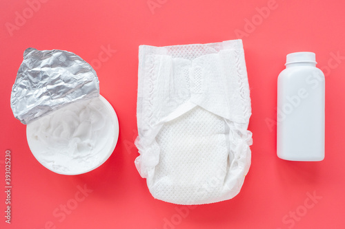 Obraz premium Composition with baby accessories and cosmetics for child care on a pink background, flat flat, top view, layout. Trendy background, hygiene of newborn girls