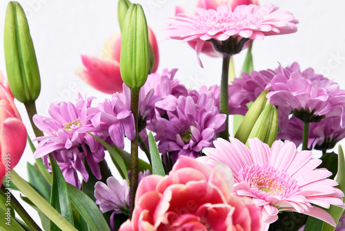 © Vieriu, Fototapeta premium Composition with beautiful blooming Tulips and Barberton Daisy (Gerbera jamesonii) flowers on white background , pink colors