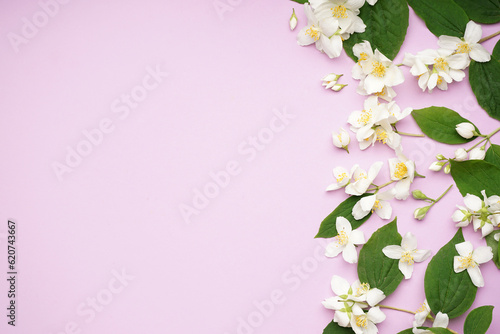 © Pixel-Shot, Obraz premium Composition with beautiful jasmine flowers and leaves on lilac background