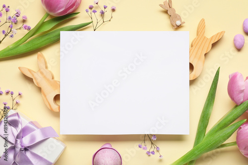 Obraz premium Composition with blank card, Easter eggs, gift box and flowers on beige background