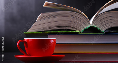 © monticellllo, Naklejka premium Composition with books and cup of coffee on the table