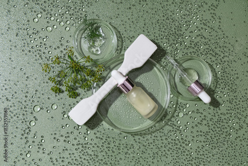 Naklejka premium Composition with bottle of dill cosmetic product and Petri dishes in water on...