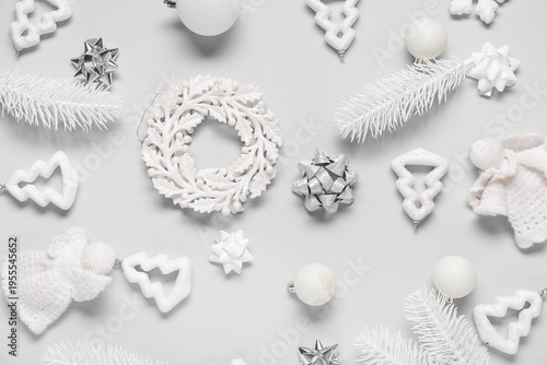 Obraz premium Composition with Christmas balls, knitted angels and decorative snowflakes on white background