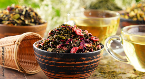 © monticellllo, Fototapeta premium Composition with cup of tea and bowls of tea leaves