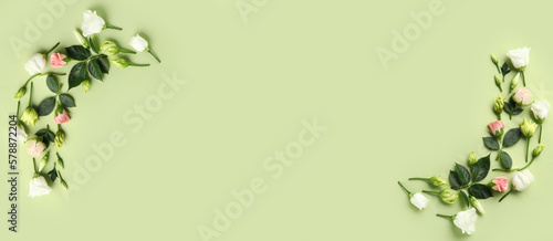 Naklejka premium Composition with eustoma and rose flowers on green background with space for...