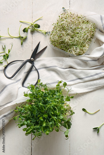 © Pixel-Shot, Naklejka premium Composition with fresh micro green sprouts, napkin and scissors on light wooden background
