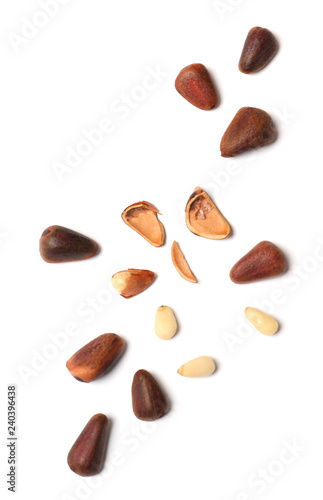 © New Africa, Obraz premium Composition with pine nuts on white background, top view