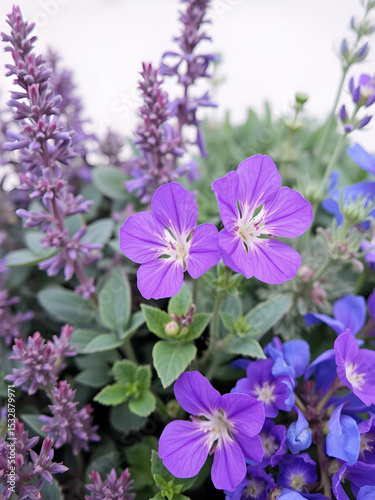 © Ann, Fototapeta premium Composition with purple sage and blue field geranium flower.