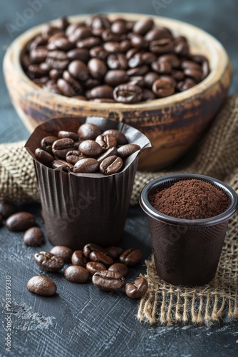 Fototapeta premium Compostable coffee pods next to coffee beans. Generative AI