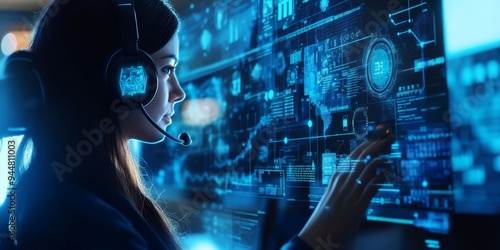 © kwanchaift, Naklejka premium Comprehensive customer support service with agents using digital platforms and personalized attention to address client needs in a contemporary setting