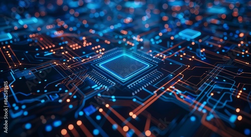 © Jahid, Obraz premium Computer chip on motherboard in cityscape, surrounded by engineering marvels