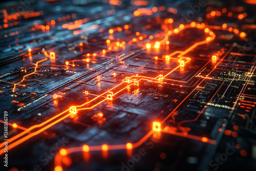 © Людмила Мазур, Fototapeta premium Computer chip with a lot of orange lights on it. The lights are arranged in a grid pattern