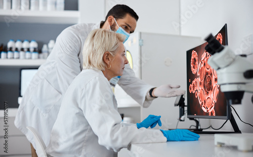© Anela R/peopleimages.com, Obraz premium Computer, covid and science in a medical research laboratory using technology for analytics of a virus on screen. Team, teamwork and technician looking at microscopic image with expert