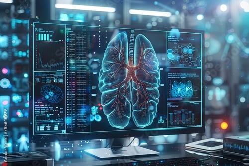 © kalyani, Obraz premium Computer interface with medical data processing against blue background. computer interface and medical research hi tech, mechanical technology concept