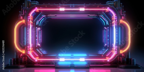 © Olmyntay, Obraz premium Computer neon frame of future quantum technologies. AI Generation