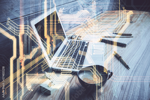 Obraz premium Computer on desktop in office with technology theme hologram. Double exposure. Tech concept.