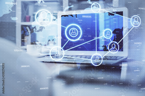 © peshkova, Naklejka premium Computer on desktop with social network theme icon. Multi exposure. Concept of international connections.
