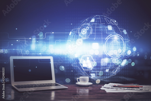 © peshkova, Naklejka premium Computer on desktop with social network theme icon. Multi exposure. Concept of international connections.