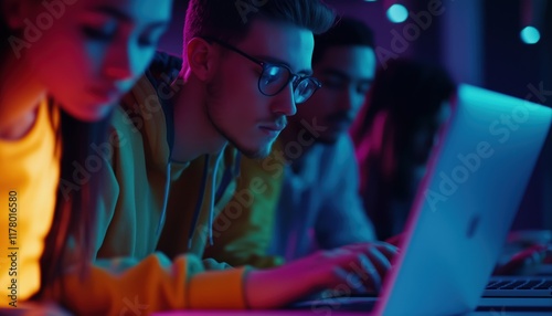 Obraz premium Computer Programmer Team Utilizing Laptops To Process Data Connected To...
