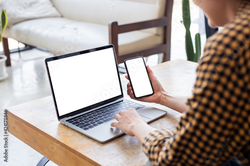 Fototapeta premium computer screen,cell phone blank mockup.hand woman work using laptop texting mobile.white background for advertising,contact business search information on desk in cafe.marketing,design