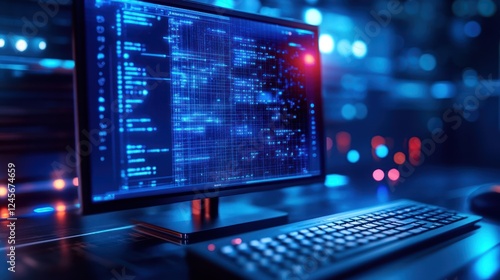 Obraz premium Computer screen displaying blue digital code in dark server room.