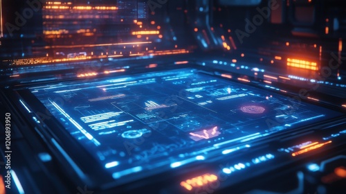 © Kittichet, Fototapeta premium Computer screen emitting blue and red glowing light in a dark environment