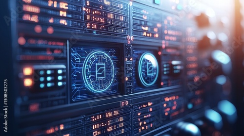 Fototapeta premium Computer screen illuminated with blue and red light creating a striking...