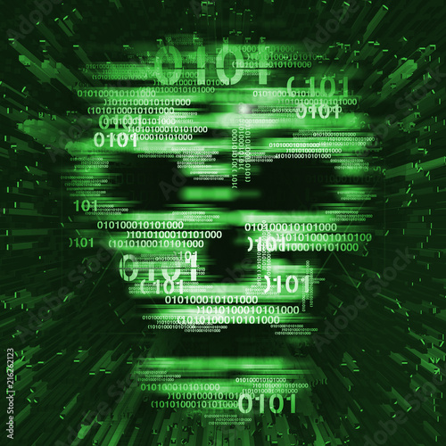 © jiris, Naklejka premium Computer virus skull danger concept. Illustration of Abstract Skull sign with binary codes on green background. Concept for online piracy, hacking.