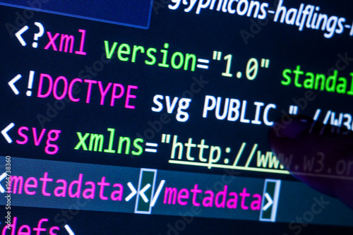 © oriol, Fototapeta premium Computer with programming code and finger touching the screen